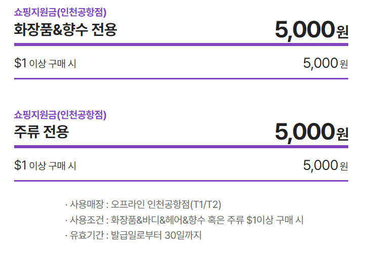 이 이벤트 응모버튼을 눌러야 오프라인 인천공항에서 사용가능한 화장품&향수 전용 5천원이랑 주류전용 5천원을 추가로 받을수 있으니 꼭꼭 챙겨받으세요!